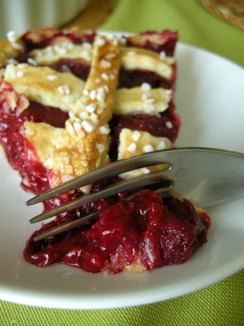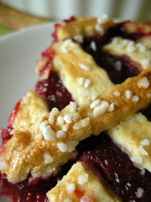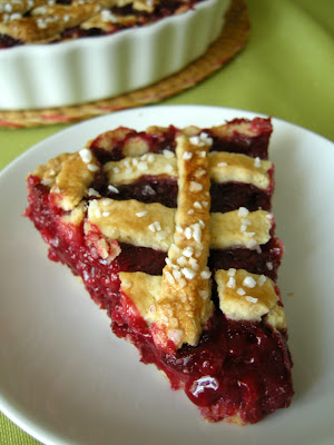 W tej tarcie zakochałam się od pierwszego wejrzenia, jak tylko ją zobaczyłam, pominęłam etap drukowania, wpinania w segregator z przepisami do wypróbowania, potem szukania gdzie to wcisnęłam, wszystko out. Pobiegłam do sklepiku po wiśnie i jest. I to jaka jest! Świetny przepis. Krucha, cudownie słodka, letnia tarta w kratkę (mam słabość do kratek, wyglądają tak fantastycznie zaściankowo). I co najlepsze – nadzienie się nie rozpaćkuje! Wiśnie trzymają się zgrabnie razem, nie wypływają, nie rozmiękczają spodu. W konsystencji przypominają coś jak bardzo gęstą konfiturę – ale tylko w konsystencji, w smaku już nie. Nie są kwaśne, ale mają swój aromat – po dodaniu wszystkich pozostałych składników do nadzienia, pozostał wiśniowy posmak, bez cierpkości. Przepis z gazety.pl, cytowany za Mają z Galerii Potraw.